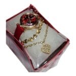 ساعة بجلد أحمر لامع ولمسة دهبي راقية، معاها إسورة قلوب وسلسلة بدلاية قلب فصوص تلمع، طقم مثالي لهدية مميزة فيها حب وشياكة.