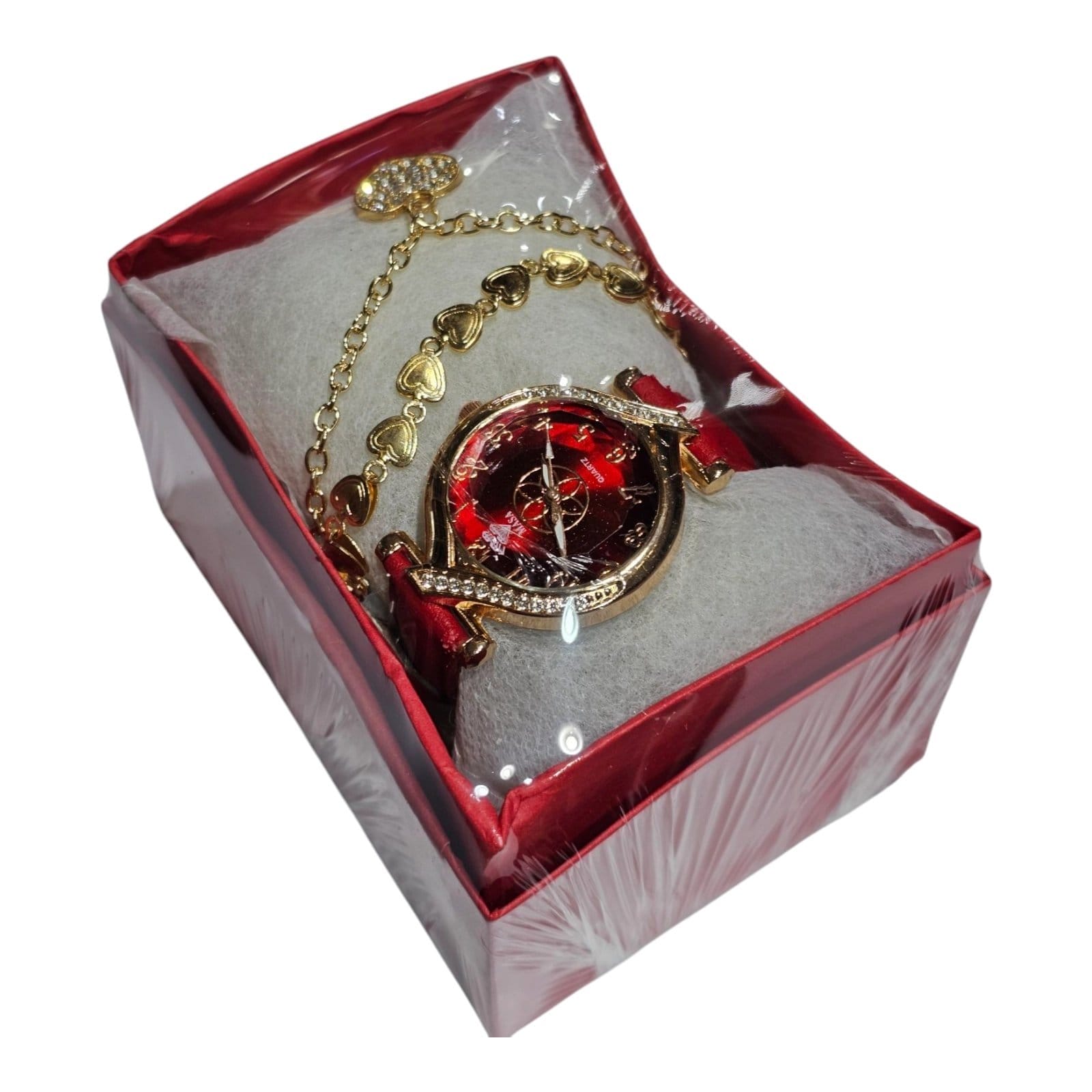 ساعة بجلد أحمر لامع ولمسة دهبي راقية، معاها إسورة قلوب وسلسلة بدلاية قلب فصوص تلمع، طقم مثالي لهدية مميزة فيها حب وشياكة.
